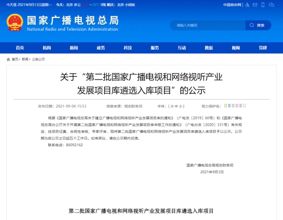 查看詳情?國(guó)家廣播電視總局規(guī)劃財(cái)務(wù)司發(fā)布《關(guān)于“第二批國(guó)家廣播電視和網(wǎng)絡(luò)視聽產(chǎn)業(yè)發(fā)展項(xiàng)目庫(kù)遴選入庫(kù)項(xiàng)目”的公示》